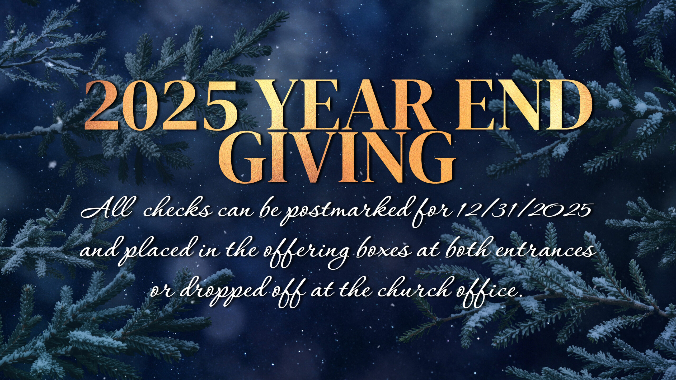 All checks can be postmarked for 12/31/2025 and placed in the offering boxes at both entrances or dropped off at the church office.